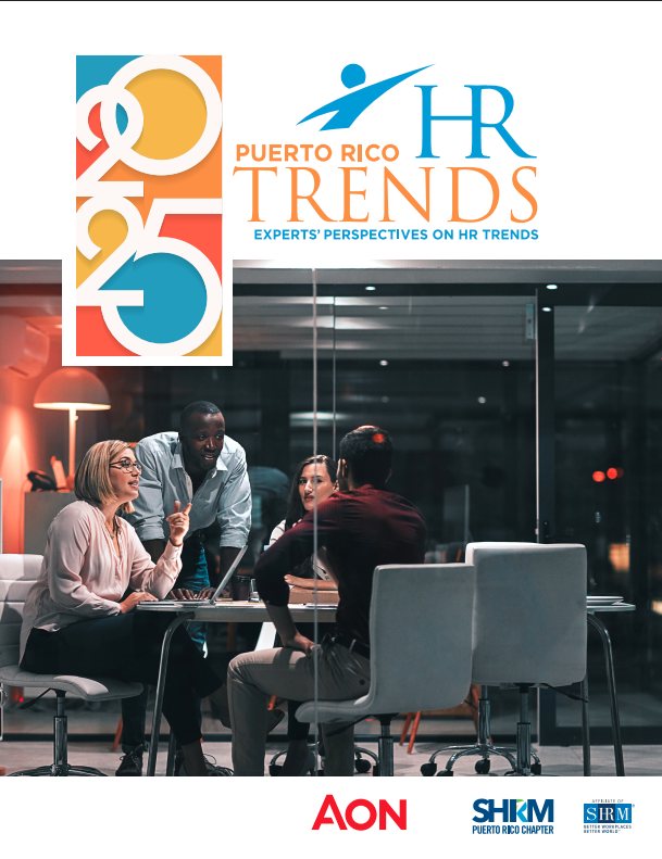 HR Trends es un análisis profundo de los cambios y tendencias de la fuerza laboral en Puerto Rico. Los recursos utilizados para el estudio son datos económicos y de empleo: Inteligencia Económica, datos de compensación, beneficios y compromiso: base de datos de Aon Puerto Rico, datos de rotación de empleados, ausentismo y cambios demográficos: cuestionario de mercado general administrado por Aon y SHRM-PR a organizaciones establecidas en Puerto Rico. Puerto Rico HR Trends es una publicación netamente puertorriqueña, desarrollada por la Sociedad para la Gerencia de Recursos Humanos, Capítulo de Puerto Rico en unión a Aon. Derechos reservados. Prohibida la reproducción parcial o total sin autorización.